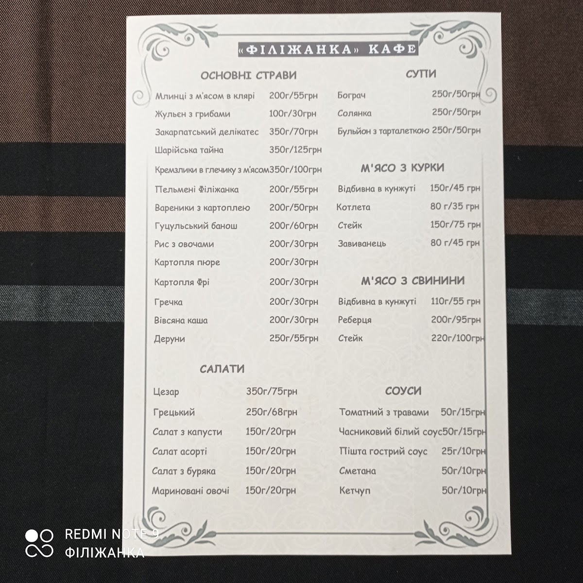 Whether you're a local or a traveler exploring Khust, Kafe Filizhanka is a must-visit destination. Offering delectable food at unexpectedly low prices, this café ensures that comfort and quality aren't just a dream but a delightful reality. With its charming atmosphere, attentive staff, and a menu filled with flavorsome dishes, it’s no wonder guests are promising to return!